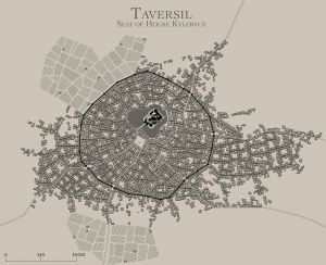 | + | |[[Image:Taversil.jpg|center|thumb|'''[[Taversil]]''', the seat of [[House Kylervus]]]] || [[Image:High-falinthoss.jpg|thumb|center|'''[[High Falinthoss]]''', in Taversil]] || | ||