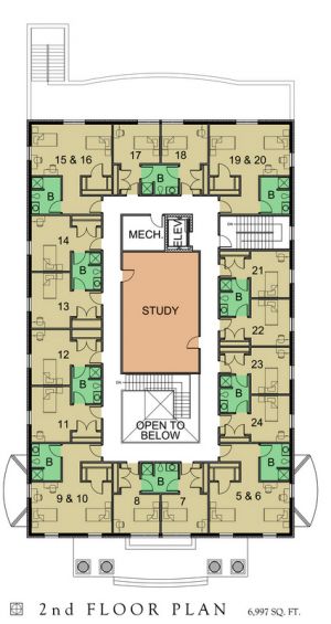 The majority of the floorplan is made up of bedrooms. Most of the rooms are one-bed room, though they usually share a bathroom with another similar room. At the corners of the building are larger rooms, which are used to either house freshmen two-to-a-room, or given to seniors by themselves (when there aren't enough freshmen to fill the rooms).