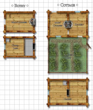 - Cottage: A two-room structure, with a standing-room attic that stretches the length of the building, accessed by a ladder or a narrow staircase along one wall. These are the very typical homes of hamlet-folk, many of whom work on farms or who work providing various services to those in the community. Such houses include a small private plot where the family may raise personal food and keep a few chickens.