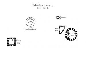 - Promenade: The battlements of this level go all the way around the building, providing a complete circle of view around the building. This space is rarely used by patrol guards, allowing it to function as a useful walking-about space for the embassy's residents.